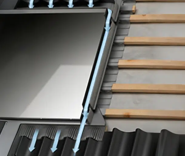 Cerco universal que se adapta tanto para ser usado en techos ondulados como lisos. Este cerco exterior de aluminio es la terminación que proporciona el sello entre la ventana y la techumbre, se acomoda a las ondulaciones del techo, y su uso es obligatorio. El cerco asegura un drenaje eficaz y evita filtración. Al igual que la ventana, el acabado exterior es lacado color grafito. Cerco de uso exclusivo para ventana FS y VSS.